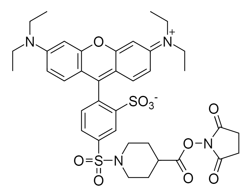 苏州北科纳米科技有限公司生产销售“LRB Red? SE”“分子量:766.88,激发(nm):558,发射(nm):575,LRB Red?是一种琥珀酰亚胺基酯,其光谱性质与氯化三聚氰胺若丹明B相同。LRB Red?仅与脂肪族胺(例如氨基酸,肽和蛋白质)反应,以产生非常稳定的鲜红色荧光共轭物。”,该产品仅用于科研,如果需要请联系我们